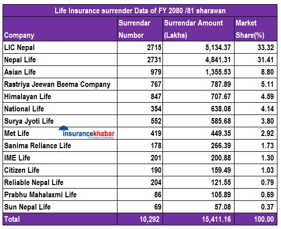 प्राप्त तथ्याङक अनुसार संचालनमा रहेका जीवन बीमा कम्पनीहरुमध्ये साउन महिनामा एलआइसी नेपालको सरेन्डर सर्वाधिक देखिएको छ । बीमा पोलिसी सरेन्डर हुनु बीमा क्षेत्रको लागि नकारात्मक सूचक हो । पछिल्लो समय बीमा क्षेत्रमा अस्वस्थ प्रतिष्पर्धा, फोर्सफुल्ली बीमा पोलिसी खरिद, प्रलोभन लगायत गतिविधीका कारण बीमा पोलिसी सरेण्डरको दर बढ्दै आएको छ । एलआइसी नेपालको २७ सय १५ वटा पोलिसी बराबर ५१ करोड ३४ लाख रुपैयाँको पोलिसी सरेण्डर भएको हो । जुन जीवन बीमा क्षेत्रको कुल सरेन्डर रकमको ३३ दशमलव ३२ प्रतिशत हिस्सा हो ।