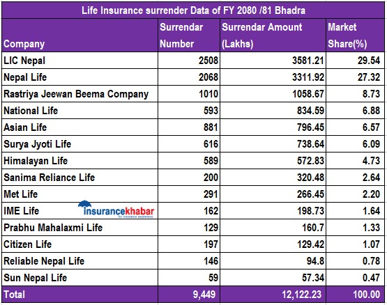 प्राप्त तथ्याङक अनुसार संचालनमा रहेका जीवन बीमा कम्पनीहरुमध्ये भदौ महिनामा एलआइसी नेपालको सरेन्डर सर्वाधिक देखिएको छ । बीमा पोलिसी सरेन्डर हुनु बीमा क्षेत्रको लागि नकारात्मक सूचक हो । पछिल्लो समय बीमा क्षेत्रमा अस्वस्थ प्रतिष्पर्धा, फोर्सफुल्ली बीमा पोलिसी खरिद, प्रलोभन लगायत गतिविधीका कारण बीमा पोलिसी सरेण्डरको दर बढ्दै आएको छ । एलआइसी नेपालको २५ सय ८ वटा पोलिसी बराबर ३५ करोड ८१ लाख रुपैयाँको पोलिसी सरेण्डर भएको हो । जुन जीवन बीमा क्षेत्रको कुल सरेन्डर रकमको २९ दशमलव ५४ प्रतिशत हिस्सा हो ।