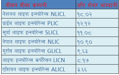 नेशनल लाइफ इन्स्योरेन्सलाइ प्राईम लाइफ इन्स्योरेन्सले पच्छाईरहेको छ उसको रु. १२.१२ रहेको छ। त्यसै गरि सूर्या लाइफ इन्स्योरेन्सको रु. ११.०८ , नेपाल लाइफ इन्स्योरेन्सको रु.१०.९० , गुराँस लाइफ इन्स्योरेन्सको रु. ९.६३, लाइफ इन्स्योरेन्स कर्पोरेसनको रु. ८.१७, र सबै भन्दा कम रु. ३.६६ प्रति शेयर आम्दानी एशियन लाइफ इन्स्योरेन्सको रहेको छ।