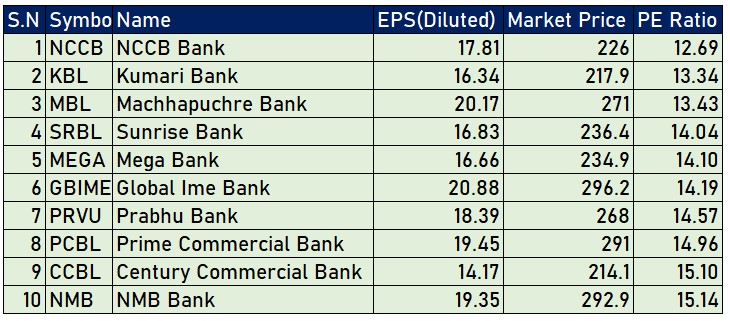 हाल नेप्सेमा कारोबार हुने गरेका २३ वटा वाणिज्य बैंकमध्ये प्रति शेयर आम्दानीको आधारमा सबैभन्दा अघि एनआईशी एशिया बैंक रहेको छ । बैंकको प्रति शेयर आम्दानी ४१ रुपैयाँ ५६ पैसा रहेको छ । त्यसैगरी सबै भन्दा थोरै प्रति शेयर आम्दानी लक्ष्मी बैंकको रहेको छ । बैंकको प्रति शेयर आम्दानी ९ रुपैयाँ ९१ पैसा रहेको छ । तेश्रो त्रैमाससम्मको तथ्याङ्क अनुसार एउटा वाणिज्य बैंकको मात्र प्रति शेयर आम्दानी १० रुपैयाँ भन्दा थोरै छ।