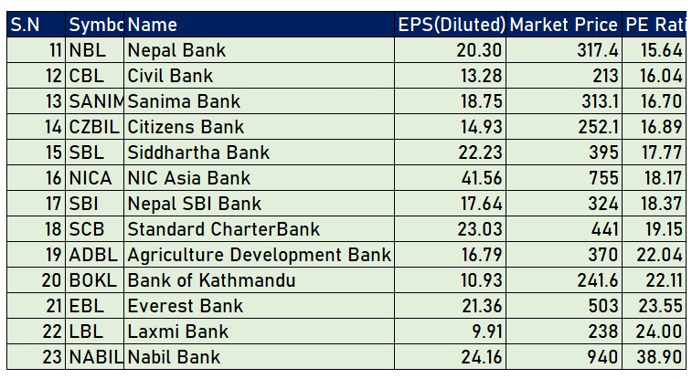 काठमाडौं । हाल नेपाली दोश्रो बजारमा २३ वाणिज्य बैंकहरुको शेयर कारोवार हुने गरेका छ । बैंक तथा वित्तीय संस्थाहरुले आर्थिक वर्ष २०७८/७९ को तेश्रो त्रैमास ( चैत्र मसान्तसम्म) को वित्तीय विवरण पनि प्रकाशित गरिसकेको अवस्था छ । नेपाल बंगलादेश बैंक, हिमालयन बैंक र नेपाल इन्भेष्टमेन्ट बैंकको भने शेयर कारोवार रोकिएको छ । सूचीकृत वाणिज्य बैंकमध्ये हाल तीन वाणिज्य बैंकको मर्जरको कारण शेयर कारोबार रोक्का भएको हुँदा २३ वटा वाणिज्य बैंकहरुको प्रति शेयर आम्दानी,बजार मुल्य र मुल्य आम्दानी अनुपातको आधारमा गरिएको अध्ययन :