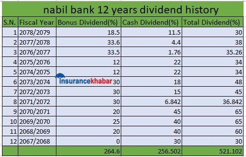 काठमाडौं । आर्थिक वर्ष २०७९/ ८० को लाभांश घोषणाको तयारीमा रहेको नबिल बैंकले आफ्ना शेयरधनीहरुलाई प्रत्येक वर्ष आकर्षक लाभांश दिंदै आएको छ। बैंकले १२ वर्षको अवधिमा कूल ५२१ दशमलव १०२ प्रतिशत लाभांश वितरण गरेको छ । कम्पनीको १२ वर्षको लाभांश इतिहास हेर्दा यस्तो देखिएको हो । कम्पनीले यस १२ वर्षको अवधिमा नगद लाभांशलाई भन्दा बोनश शेयरलाई नै प्राथमिकता दिएको छ । कम्पनीले यस अवधिमा २६४ दशमलव ६ प्रतिशत बोनश शेयर वितरण गरेको छ भने २५६ दशमलव ५०२ प्रतिशत नगद लाभांश वितण गरेको हो ।