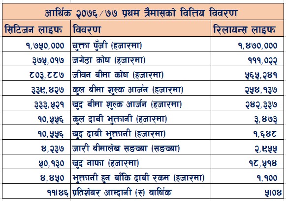 प्रथम त्रैमासको अन्त्यसम्ममा सिटिजन लाइफ इन्स्यारेन्स कम्पनीको १ करोड ७५ लाख रुपैयाँ चुक्ता पूँजी रहेको छ भने रिलायन्स लाइफ इन्स्योरेन्स कम्पनीको १ करोड ४७ लाख रुपैँया चुक्ता पूँजी रहेको छ ।