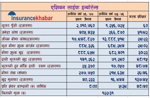 एशियन लाईफ इन्स्योरेन्सले चालु आर्थिक वर्षको प्रथम त्रैमासको वित्तीय प्रतिवेदन सार्वजनिक गरेको छ।