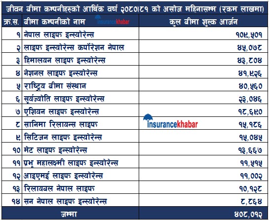 त्यस्तै, नेशनल लाइफ इन्स्योरेन्स कम्पनीले ४ अर्ब १९ करोड कुल बीमा शुलक आर्जन गरेको हो । राष्ट्रिय बीमा संस्थानले ४ अर्ब ५ करोड कुल बीमा शुलक आर्जन गरेको हो । सूर्यज्योति लाइफले २ अर्ब ३० करोड कुल बीमा शुलक आर्जन गरेको हो । एशियन लाइफ इन्स्योरेन्सले १ अर्ब ८६ करोड कुल बीमा शुलक आर्जन गरेको हो । सानिमा रिलायन्स लाइफले १ अर्ब ५१ करोड कुल बीमा शुलक आर्जन गरेको हो ।
