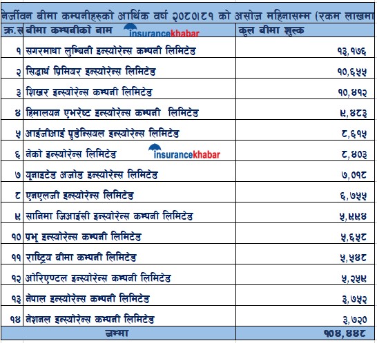 यस अवधिमा सबैभन्दा धेरै सगरमाथा लुम्बिनी इन्स्योरेन्स कम्पनीले कुल बीमा शुल्क संकलन गरेको छ । कम्पनीले यस अवधिसम्ममा १ अर्ब ३१ करोड ७६ लाख रुपैयाँ कुल बीमा शुल्क आर्जन गरेको छ । दोस्रोमा सिद्धार्थ प्रिमियर इन्स्योरेन्स कम्पनी रहेको छ । कम्पनीले यस अवधिमा १ अर्ब ६ करोड ५५ लाख रुपैयाँ कुल बीमा शुल्क आर्जन गरेको छ ।