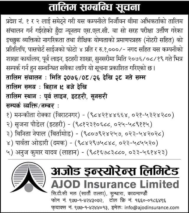काठमाडौं । अजोड इन्स्योरेन्सले निर्जीवन बीमा अभिकर्ताहरुको लागि तालिम संचालन गनृै भएको छ । कम्पनीले प्रदे नं १ र २ का अभिकर्ताहरुलाई समेट्ने गरी ताालिम संचालन गर्न लागेको जनाएको छ ।