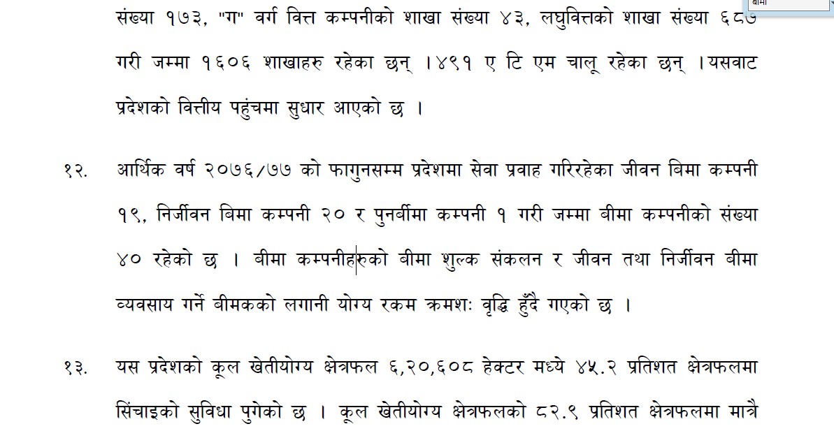 त्यस्तै बुँदा नं १३२ मा बीमा गर्न प्रोत्साहन गरिने उल्लेख छ । प्रदेश १ का आर्थिक मामिला तथा योजना मन्त्री इन्द्र बहादुर आङ्बोले पेश गरेको बजेटमा जनतालाई राहत दिन बीमामा प्रोत्साहन गरिने उल्लेख गरेका छन् । सो बुँदामा भनिएको छ, ‘स्थानीय स्तरमा रोजगारी सिर्जना गर्ने उत्पादनमूलक र छिटो प्रतिफल प्राप्त गर्न सकिने उद्यमहरुलाई प्राथमिकतामा राखी प्रोत्साहन गरिने छ । यस्ता उद्यमहरुको विकास, विस्तार तथा प्रबद्र्धन गर्न उपयुक्त नीति, नियम, प्रदेशको औद्योगिक उत्पादनको पहिचान चिन्ह निर्माण र बीमा जस्ता प्रावधानबाट प्रोत्साहन गरिनेछ’ ।