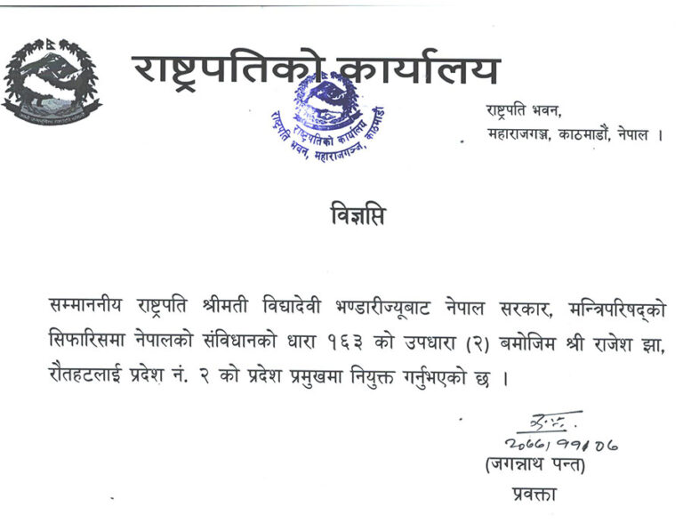 काठमाडौं । प्रदेश २ को प्रदेश प्रमुखमा राजेश झा नियुक्त भएका छन् ।मन्त्रिपरिषद्को सिफारिसमा राष्ट्रपति विद्यादेवी भण्डारीले रौतहटका झालाई प्रदेश प्रमुख नियुक्त गरेकी हुन् । यसअघि राष्ट्रपतिले प्रदेश प्रमुख तिलक परियाारलाई पदमुक्त गरेकी थिइन् ।