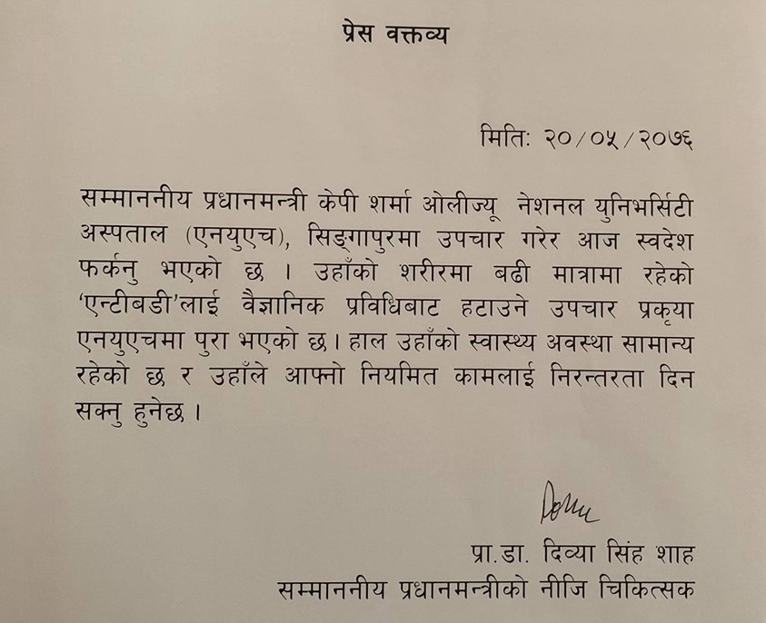 काठमाडौंस्थित विमानस्थलमा प्रधानमन्त्री आलीलाई उपप्रधानमन्त्री, मन्त्रीहरु लगायत विशिष्ट व्यक्तिहरुले स्वागत गरेका थिए । सिंगापुरमै हुँदा प्रधानमन्त्री ओलीले मन्त्रिपरिषदको बैठकमा दुइ पटक भिडियो कन्फ्रेरेन्स गरेका थिए । प्रधानमन्त्रीको स्वास्थ्यमा सुधार भएपछि स्वदेश फर्केका हुन् ।