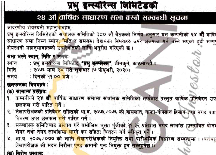 काठमाडौं । प्रभु इन्स्योरेन्सले माघ २४ गते २४ औँ वार्षिक साधारण सभा आव्हान गरेको छ । कम्पनीको ३८० औं बैंठकले उक्त सभाको मिति घोषणा गरेको हो । सभा प्रभु कम्प्लेक्स, तीनकुने, काठमाण्डौमा बिहान ११ बजे शुरु हुने कम्पनीले जनाएको छ ।