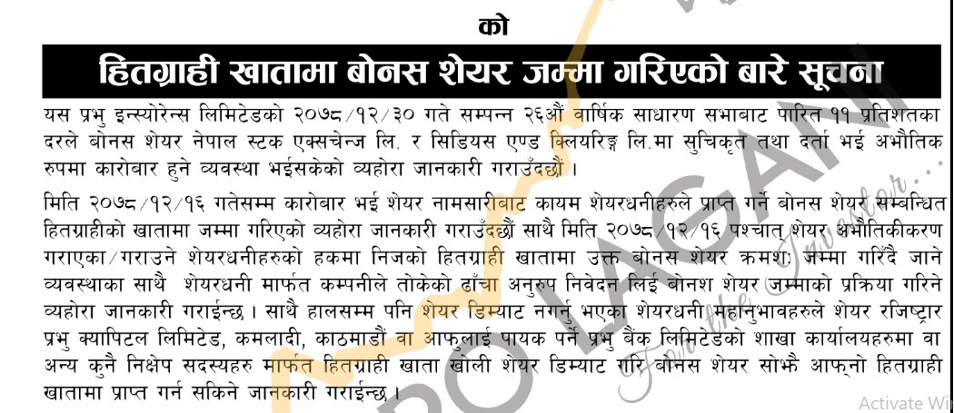 काठमाडौं । प्रभु इन्स्योरेन्स लिमिटेडले ११ प्रतिशत बोनश शेयर वितरण गरेको छ । कम्पनीले गत चैत ३० गते २६औं वार्षिक साधारण सभाबाट पारित गरेको लाभांश वितरण गरेको हो ।
