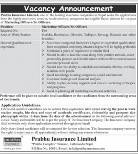 प्रभु इन्स्योरेन्सले काठमाडौं बाहिर विभिन्न जिल्लामा कर्मचारी माग गरेको छ । कम्पनीले माकेटिङ अफिसर र सिनियर अफिसरको लागि कर्मचारी माग गरेको हो । कम्पनीले गोर्खा, बेसीसहर, घोराही, तुलसीपुर, केरुङ, दमौली र अन्य शाखाहरुको लागि ब्याजलर डिग्री वा सो भन्दा माथि अध्यनरत व्यक्तिले आवेदन दिन पाउने भएको छ । कम्तीमा दुई बर्षको अनुभव रहेको व्यक्तिले आफनो बायोडाटा सहित अनलाईन मार्फत आवेदन दि न पाउने व्यवस्था गरिएको छ ।