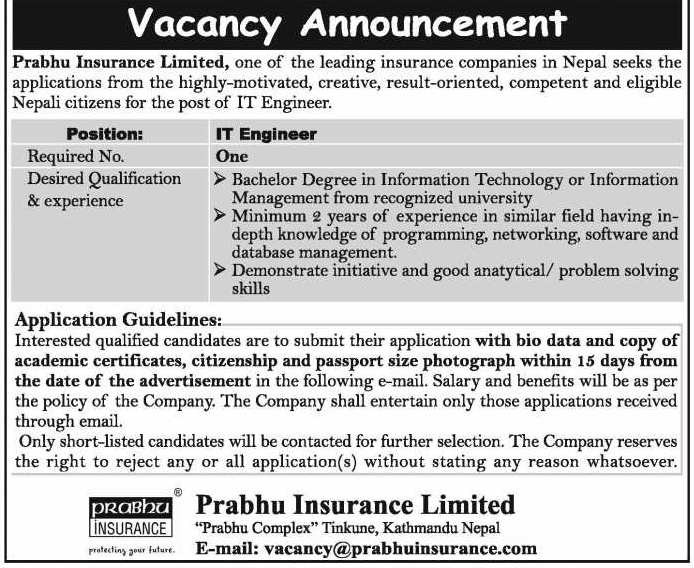काठमाडौं । प्रभु इन्स्योरेन्स कम्पनी लिमिटेडले विभिन्न पदका लागि कर्मचारीको माग गरेको छ । कम्पनीले आइटी इन्जिनियर पदका लागि एक जना कर्मचारी माग गरेको जनाएको छ ।