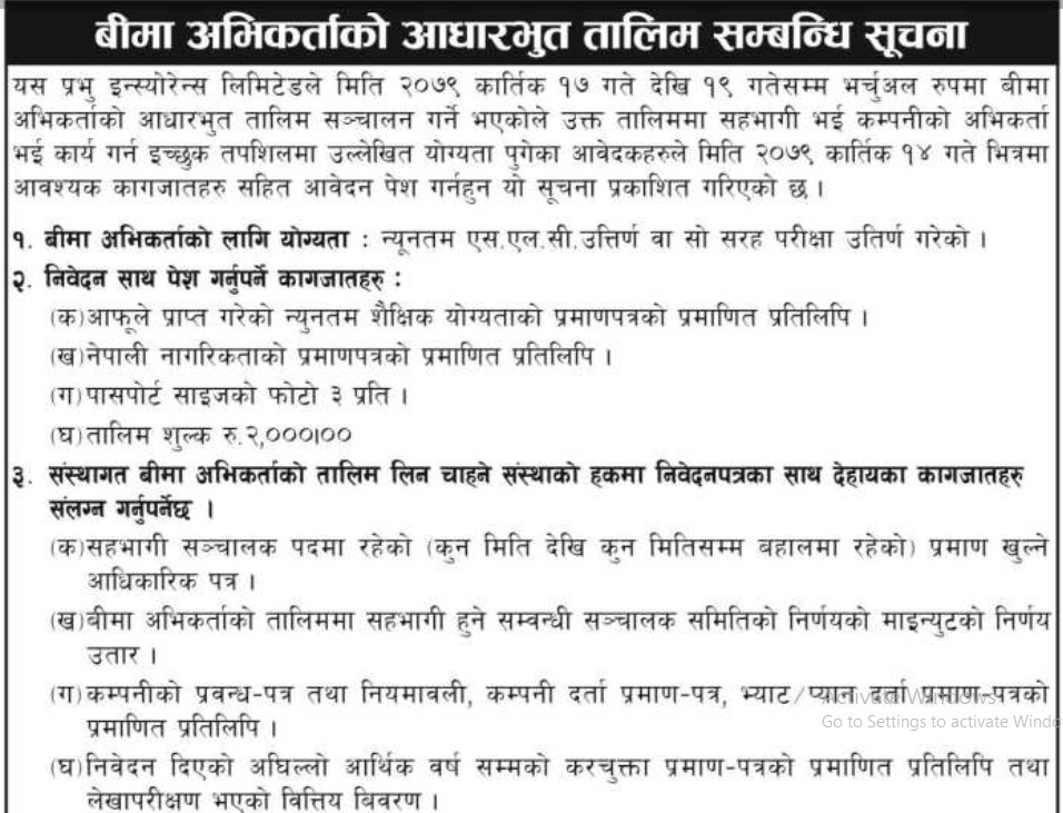संस्थागत अभिकर्ताको हकमा पनि तालिम शुल्क दुई हजार लाग्नेछ । उक्त तालिम प्रभु इन्स्योरेन्स कम्पनीको केन्द्रीय कार्यालय तिनकुने काठमाडौंमा हुनेछ ।