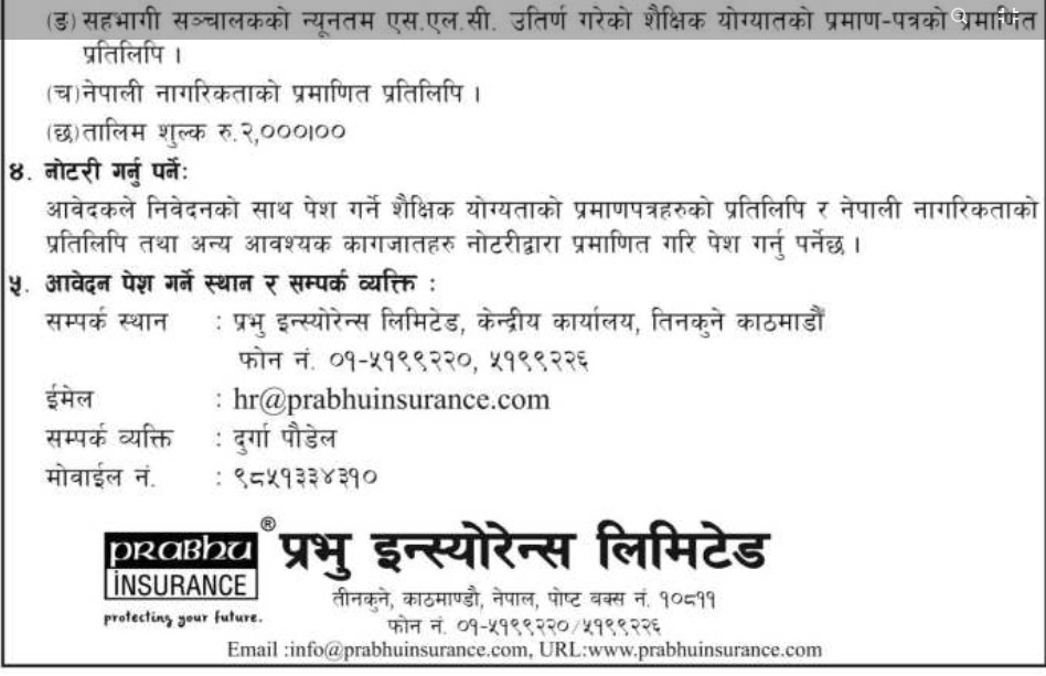 काठमाडौं । प्रभु इन्स्योरेन्स कम्पनीले बीमा अभिकर्ताको आधारभुत तालिम संचालन गर्ने भएको छ । कम्पनीले कार्तिक १७ गतेदेखि १९ गतेसम्म बीमा अभिकर्ताको आधारभुत तालिम संचालन गर्ने जनाएको छ । उक्त तालिममा सहभागी भई कार्य गर्न ईच्छुकले कार्तिक १४ गतेभित्र आवश्यक कागजातहरु सहित कम्पनीका आवेदन दिन आग्रह गरेको छ ।