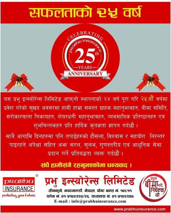 काठमाडौं । प्रभु इन्स्योरेन्स कम्पनी आफ्नो स्थापनाको २४ औं वर्ष पुरा गरी २५ औं वर्षमा प्रवेश गरेको छ । सोही अवसरमा कम्पनीले ग्राहक, बीमा समिति, सरोकारवाला पक्षहरु, शेयरधनीहरु, व्यवसायिक प्रतिष्ठानहरु तथा शुभ चिन्तकहरुमा आभार प्रकट गरेको छ ।