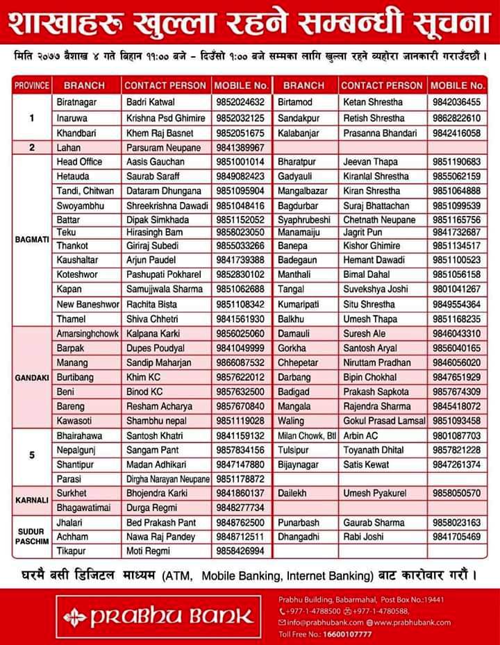 प्रभु बैंकको आज खुला रहने शाखा कार्यालयहरु