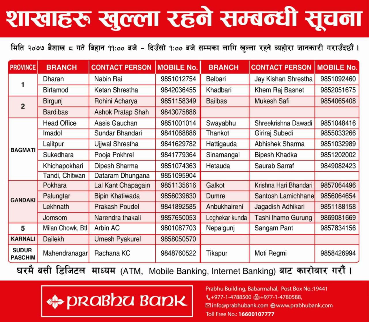 प्रभु बैंकको आज खुला हुने शाखा कार्यालयहरु