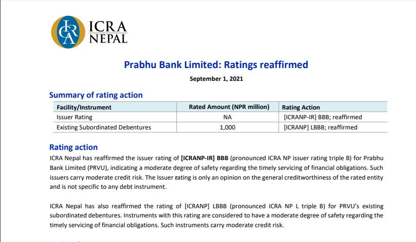 काठमाडौं । प्रभु बैंकको ऋणपत्रलाई इक्रा नेपालले इक्रा एनपी एल ट्रिपल बी रेटिङ प्रदान रेटिङ प्रदान गरेको छ । कम्पनीले १ अर्ब रुपैयाँ बराबरको १० लाख कित्ता ऋणपत्र निष्काशन गर्नका लागि रेटिङ गराएको हो ।