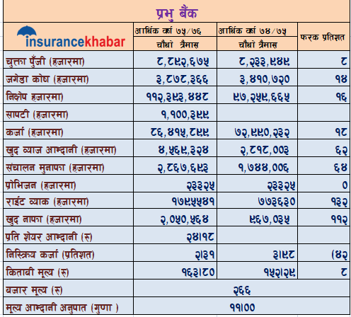 प्रभु बैंकले आर्थिक वर्ष २०७५।७६ को वित्तीय विवरण प्रकाशित गरेको छ । प्रभुले चौथो त्रैमाससम्ममा २ अर्ब ५ करोड ५ लाख ६४ हजार रुपैयाँ नाफा कमाएको छ । अघिल्लो आर्थिक वर्षको सोही अवधिको तुलनामा बैंकको नाफा १ सय १२ प्रतिशतले बढी हो । अघिल्लो वर्ष यसै अवधिमा बैकले ९६ करोड ७० लाख रुपैयाँ मात्र खुद नाफा कमाएको थियो ।