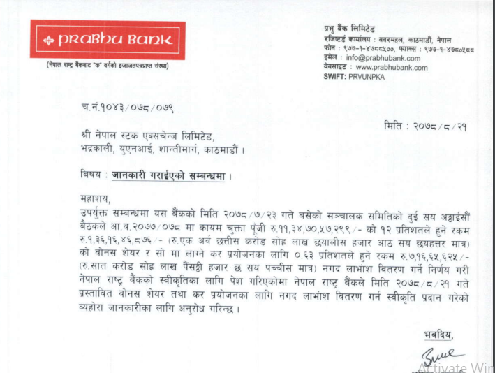 काठमाडौं । प्रभु बैंकको प्रस्तावित लाभांश नेपाल राष्ट्र बैंकले स्वीकृत दिएको छ। राष्ट्र बैंकले उक्त लाभांश मङ्सिर २१ गते स्वीकृत गरेको हो।