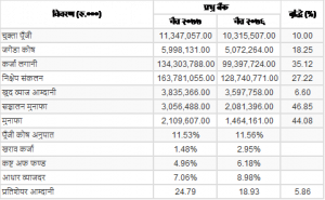 बैंकले चालु आर्थिक वर्षको ९ महिनाको अवधिमा एक खर्ब ६३ अर्ब रुपैयाँ निक्षेप संकलन गरि एक खर्ब ३४ अर्ब रुपैयाँ कर्जा लगानी गरेको छ । यहि अवधिमा बैंकले २७ प्रतिशतले निक्षेप सुधार गरेको छ भने कर्जा लगानी ३५ प्रतिशतले बढाएको छ ।