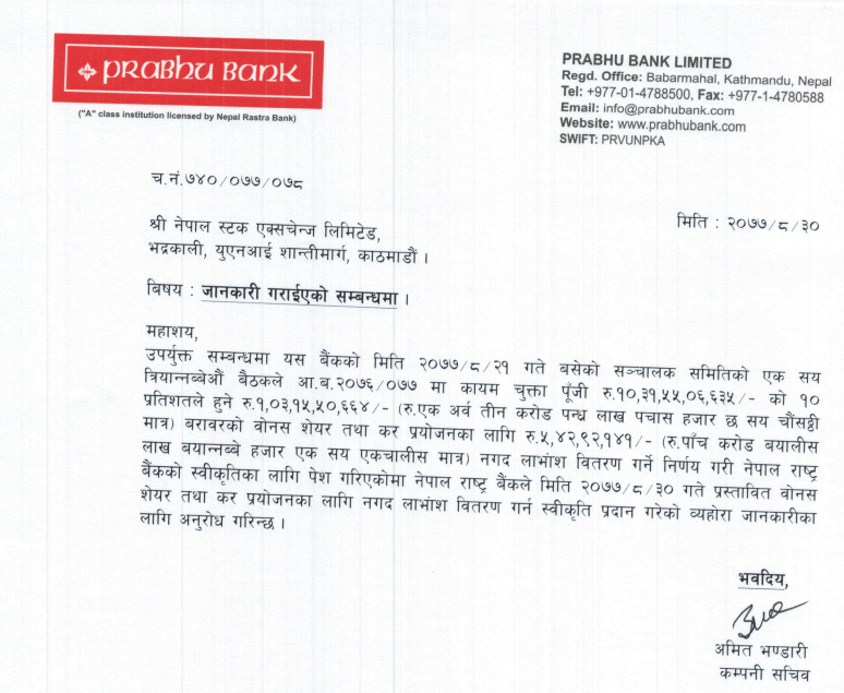 उक्त लाभांश बैंकको आगामी साधारणसभाले पारित गरेपछि लगानीकर्ताले पाउनेछन् ।