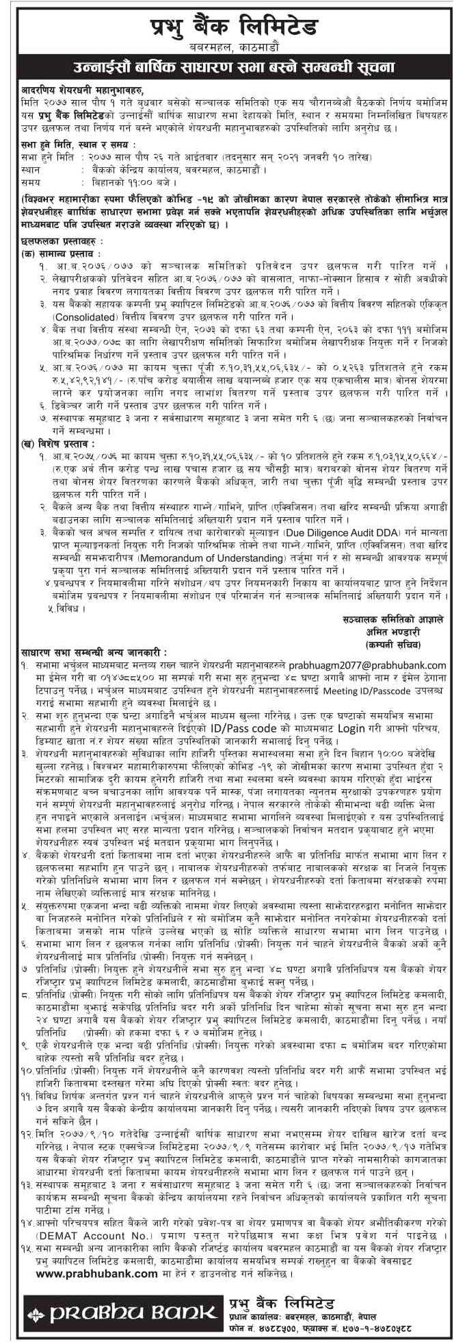 काठमाडौं । प्रभु बैंक लिमिटेडले पुष २६ गते वार्षिक साधारण सभा गर्ने भएको छ । बैंकको पुष १ गते बुधबार बसेको सञ्चालक समितिको बैठकले गरेको निर्णय अनुसार बैंकको १९औं वार्षिक साधारण सभाको मिति तय गरेको हो । बैंकको केन्द्रिय कार्यालय, बबरमहल, काठमाडौंमा बिहान ११ बजेबाट भर्चुअल माध्यमबाट सञ्चालन हुने जनाएको छ ।