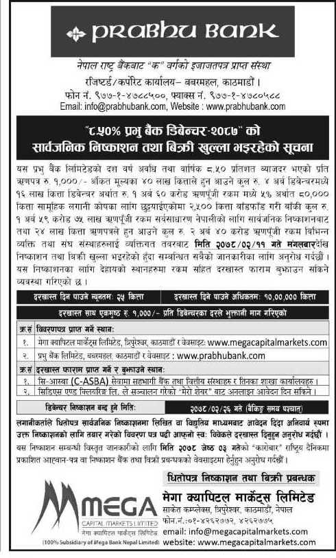 बिक्री प्रबन्धकमा मेगा क्यापिटल रहेको छ । प्रभु बैंकलाई इक्रा नेपालले ‘इक्रा एनपी इस्युअर रेटिङ ट्रिपल बी’ रेटिङ दिएको छ ।