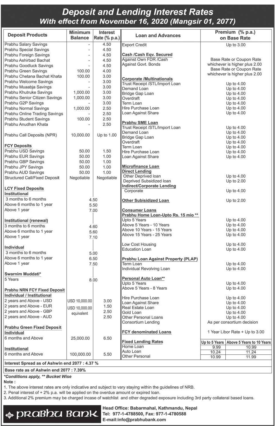 काठमाडौं । प्रभु बैंक लिमिटेडले नयाँ व्याजदर सार्वजनिक गरेको छ । बैंकले विभिन्न खातामा मंसिर १ गते सोमबारबाट लागू हुने गरी नयाँ व्याजदर सार्वजनिक गरेको हो ।
