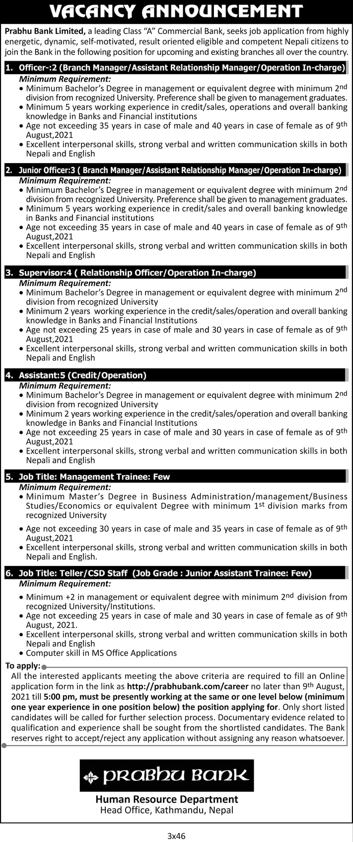 काठमाडौँ । प्रभु बैंक लिमिटेडले विभिन्न पदका लागि ठुलो सख्यामा कर्मचारीको माग गरेको छ । बैंकले अफिसरमा ब्रान्च म्यानेजर, असिस्टेन्ट रिलेशसिप म्यानेजर र अपरेशन इन्चार्चका लागि केही, जुनियर अफिसरमाब्रान्च म्यानेजर असिस्टेन्ट रिलेशसिप म्यानेजर र अपरेशन इन्चार्चका लागि केही, सुपरभाइजरमारिलेशनसिज अफिसर र अपरेशन इन्चार्चका लागि केही, असिस्टेन्टका लागि केही, म्यानेजमेन्ट ट्रेनिका लागि केही र ट्रेलर वा सीएसडी स्टाफ पदका लागि केही संख्यामा कर्मचारीको माग गरेको हो ।