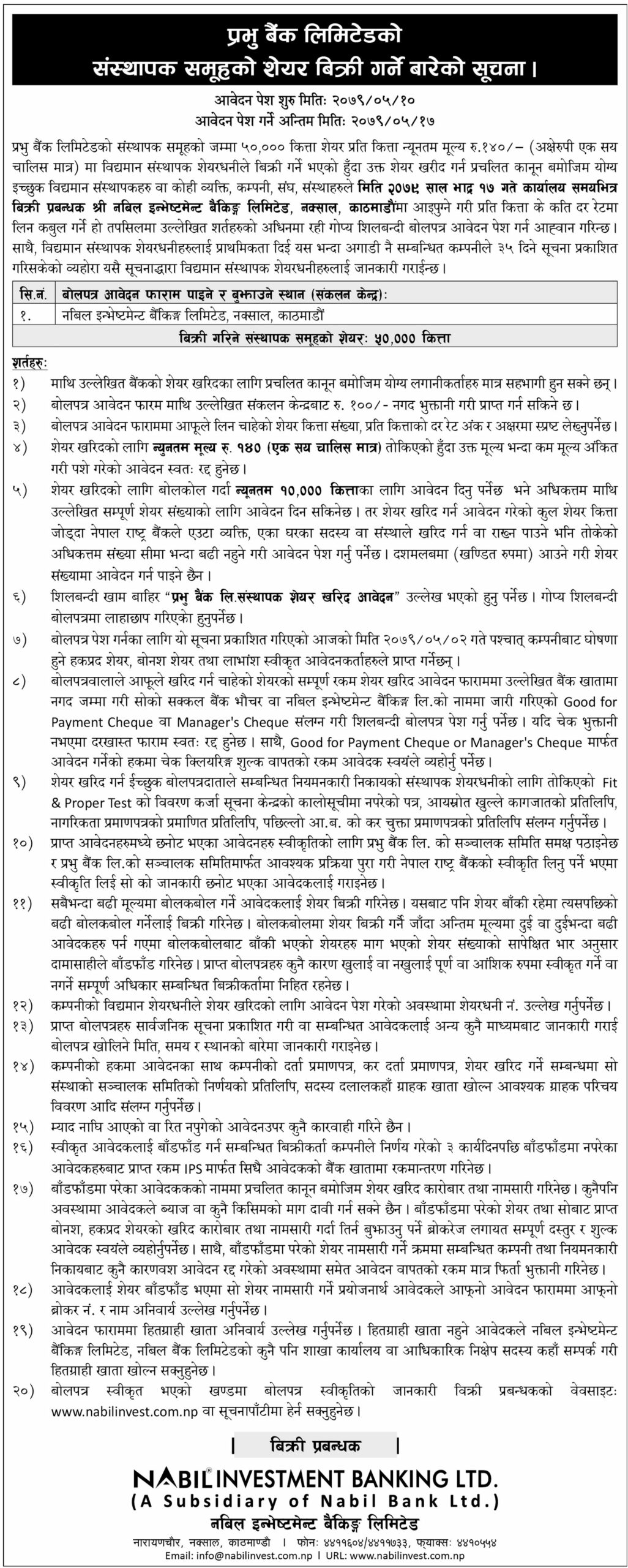 खरीद गर्न योग्य इच्छुक जो कोही व्यक्ति, कम्पनी वा संस्थाले उक्त संस्थापक शेयरमा भदौ १७ गतेभित्र विक्री प्रबन्धक नबिल इन्भेष्टमेन्ट बैकिङ नक्सालमा शिलबन्दी बोलपत्र आवेदन पेश गर्नुपर्नेछ ।
