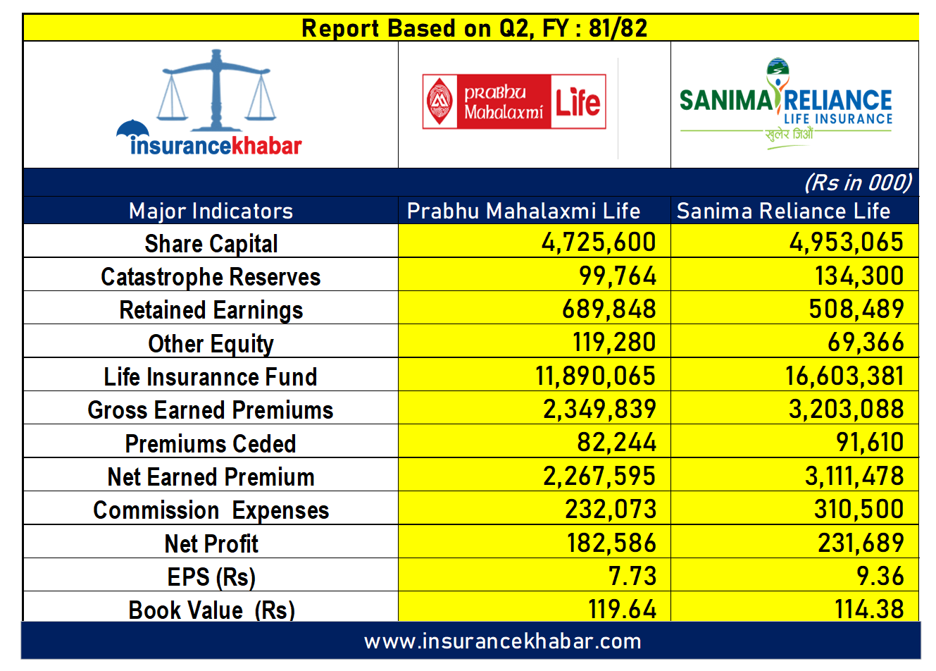 कुल बीमाशुल्क आर्जनः प्रभु महालक्ष्मीले चालु आर्थिक वर्षको दोस्रो त्रैमाससम्म २ अर्ब ३४ करोड रुपैयाँ कुल बीमाशुल्क आर्जन गरेको छ भने सानिमा रिलायन्सले ३ अर्ब २० करोड रुपैयाँ कुल बीमाशुल्क आर्जन गरेको छ।