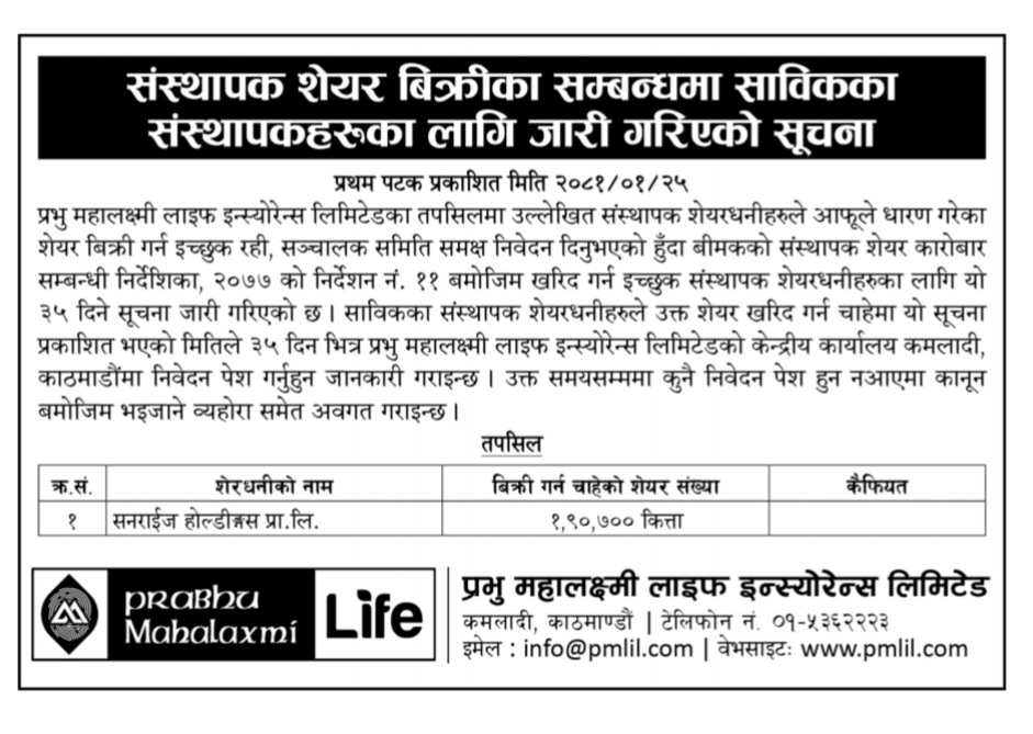 काठमाडौं । प्रभु महालक्ष्मी लाइफ इन्स्योरेन्स लिमिटेडले संस्थापक शेयर बिक्री गर्ने भएको छ । कम्पनीले संस्थापक शेयरधनी सनराईज होल्डीङ्गस प्रा.लि.को नाममा रहेको १ लाख ९० हजार ७ सय कित्ता शेयर बिक्री गर्न लागेको जनाएको छ ।