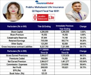 काठमाडौं । प्रभु महालक्ष्मी लाइफ इन्स्योरेन्स लिमिटेडले चालु आर्थिक वर्ष २०८०।८१ को तेस्रो त्रैमास (साउन–चैत)सम्मको अपरिष्कृत वित्तीय विवरण सार्वजनिक गरेको छ।