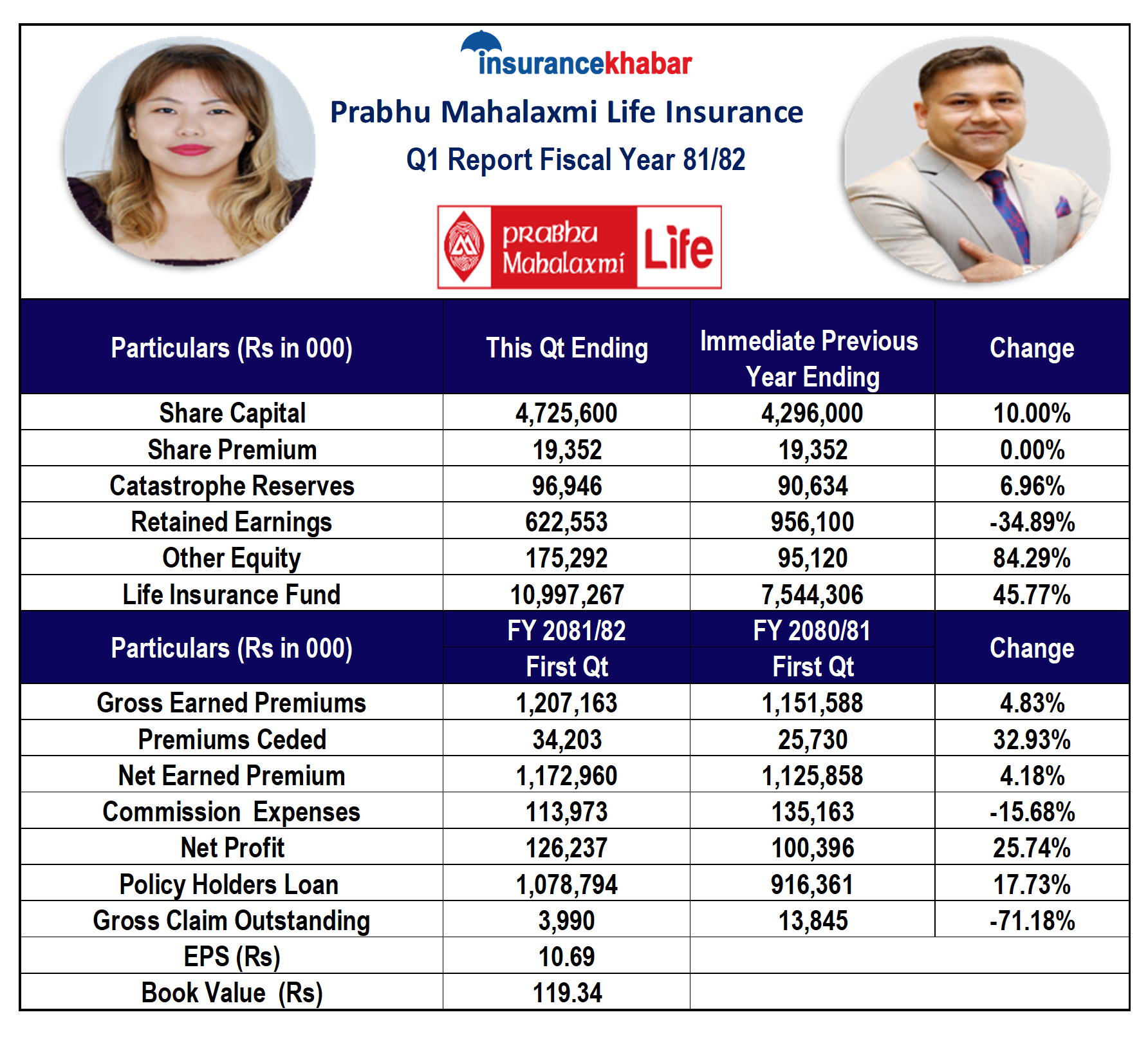 काठमाडौं । प्रभु महालक्ष्मी लाइफ इन्स्योरेन्सले चालु आर्थिक वर्ष २०८१।८२ को प्रथम त्रैमास (साउन–असोज)सम्मको अपरिष्कृत वित्तीय विवरण सार्वजनिक गरेको छ। बीमा कम्पनीहरुमा प्रथम त्रैमासको वित्तीय विवरण सार्वजनिक गर्ने प्रभु महालक्ष्मी लाइफ पहिलो कम्पनी बनेको छ।