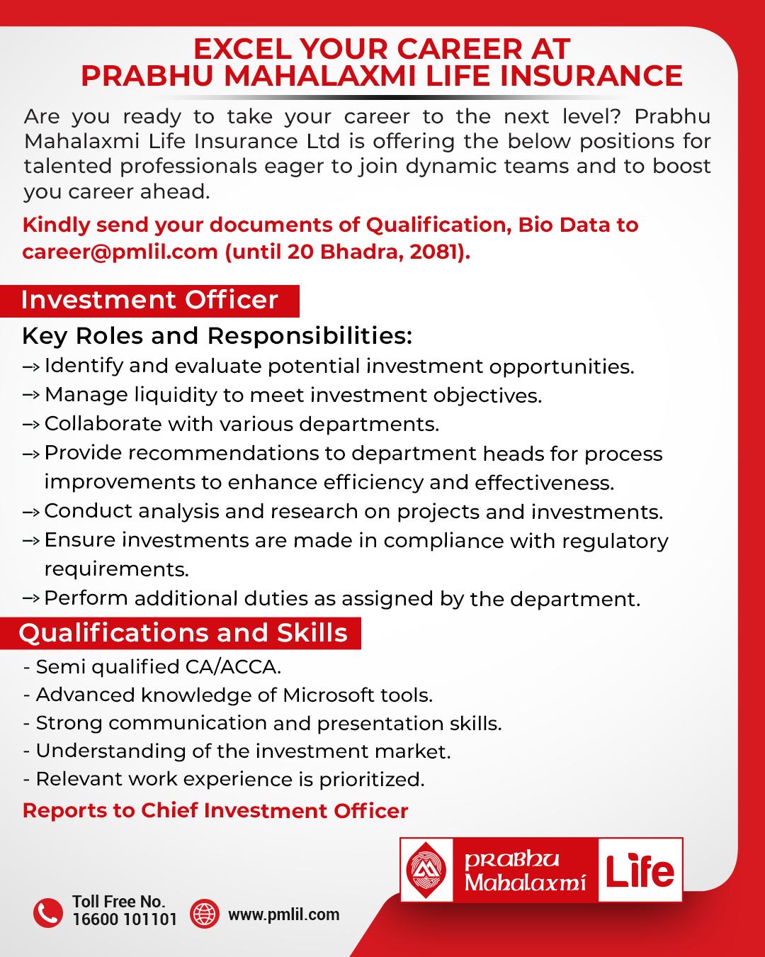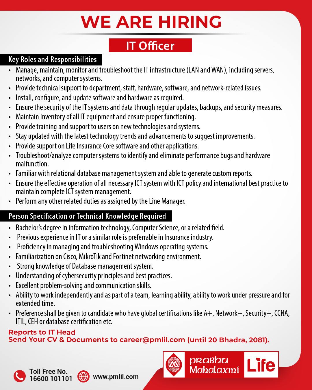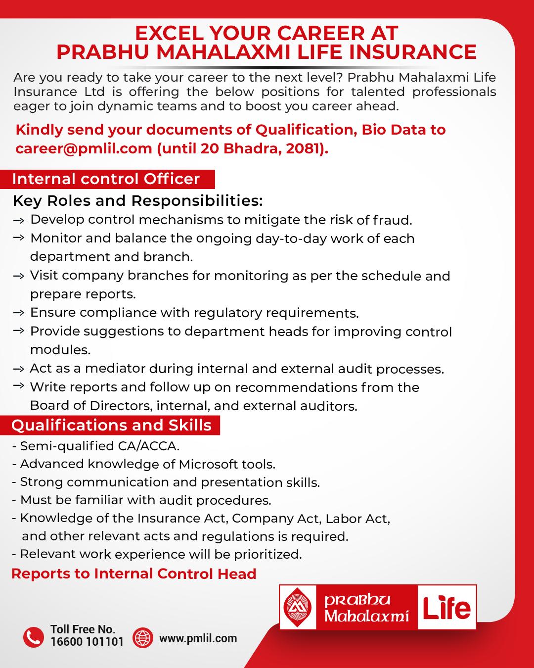 काठमाडौं । प्रभु महालक्ष्मी लाइफ इन्स्योरेन्स कम्पनीले विभिन्न ३ पदका लागि कर्मचारी माग गरेको छ । कम्पनीले आइटी अफिसरका लागि, इन्ट्रनल कन्ट्रोल अफिसरका लागि र इन्भेष्टमेन्ट अफिसरका लागि कर्मचारी माग गरेको हो । कम्पनीले केन्द्रीय कार्यालय तथा शाखा कार्यालयका लागि कर्मचारी माग गरेको हो । ईच्छुक तथा योग्यता पुगेकाले भदौ २० गतेभित्र आवेदन दिनुपर्नेछ ।