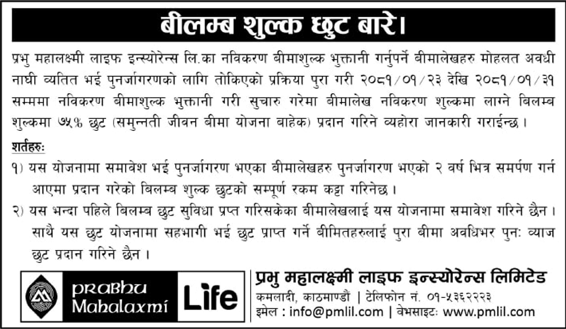 काठमाडौं । प्रभु महालक्ष्मी लाइफ इन्स्योरेन्स कम्पनीले व्यतित बीमालेख नविकरण गर्दा ७५ प्रतिशत ब्याज छुट दिने भएको छ । कम्पनीले बीमितहरुको मागलाई ध्यानमा राखी कम्पनीबाट जारी भएका र विभिन्न कारणले बीमाशुल्क तिर्न बाँकी भई म्याद नाघेका व्यतित बीमालेखहरुमा छुट दिने जनाएको छ ।