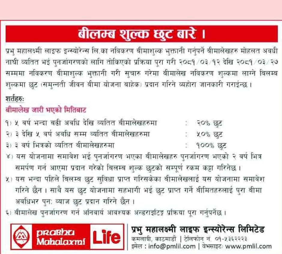 कम्पनीले व्यतित भएका बीमालेखहरु २०८१ आज असार १२ गतेदेखि असार २७ गतेसम्म आवश्यक प्रकृया पूरा गरी पुनर्जागरण गर्दा ५ भन्दा भन्दा बढी देखि व्यतित भएका बीमालेखहरुमा २० प्रतिशत, ३ देखि ५ वर्ष अवधिसम्म व्यतित भएका बीमालेखहरुमा ५० प्रतिशत र ३ वर्षभित्रको व्यतित बीमालेखहरुमा शतप्रतिशत विलम्ब शुल्क (ब्याज)मा छुट गर्ने जनाएको छ ।