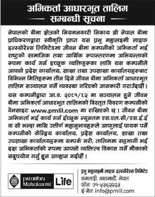 काठमाडौं । प्रभु महालक्ष्मी लाइफ इन्स्योरेन्सले जीवन बीमा अभिकर्ताको आधारभूत तालिम सञ्चालन गर्ने भएको छ । कम्पनीले अभिकर्ता भई कार्य गर्न इच्छुक व्यक्तिका लागि चालु आर्थिक वर्ष २०८१/०८२ को विभिन्न मितिहरूमा तालिम सञ्चालन गर्न लागेको हो ।