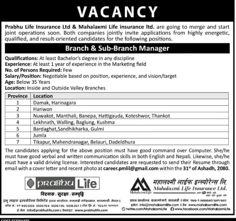 काठमाडौं। प्रभु महालक्ष्मी लाइफले सातै प्रदेशका लागि कर्मचारी माग गरेको छ । एक आपसमा मर्ज भई छिट्टै एकिकृत कारोबार गर्न लागेका प्रभु लाइफ इन्स्योरेन्स कम्पनी र महालक्ष्मी लाइफ इन्स्योरेन्स कम्पनीले आफ्ना विभिन्न शाखा तथा उप शाखा कार्यालयका लागि कर्मचारी आवश्यक परेकाले कर्मचारी माग गरेको हो ।