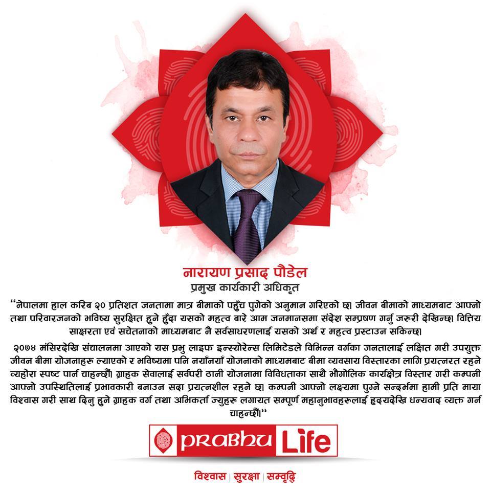 काठमाडौँ । प्रभु लाइफ इन्स्योरेन्सका प्रमुख कार्यकारी अधिकृत नारायण प्रसाद पौडेलले जीवन बीमाको महत्व दर्साउँदै सामाजिक सञ्जालमार्फत सन्देश प्रवाह गरेका छन् ।