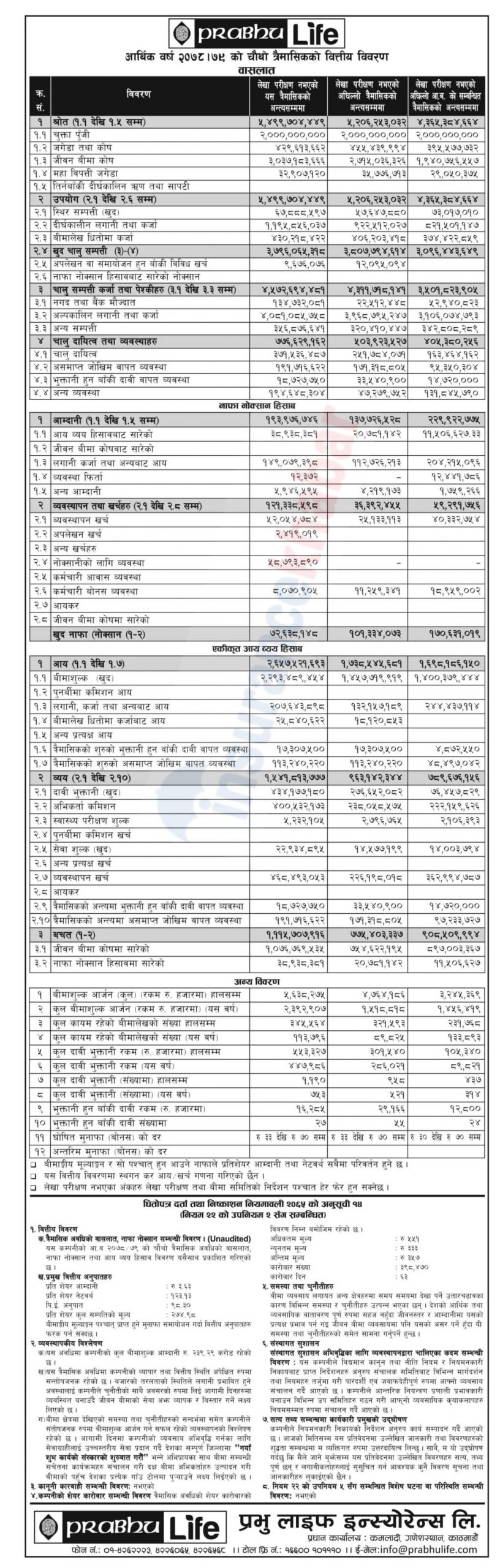 काठमाडौं । प्रभु लाइफ इन्स्योरेन्स कम्पनीले आर्थिक वर्ष २०७८/ ७९ को चौथो त्रैमासको अपरिष्कृत वित्तीय विवरण प्रकाशन गरेको छ । कम्पनीले प्रकाशन गरेको वित्तीय विवरण अनुसार कम्पनीको नाफा बाहेक अधिकांश सूचकमा राम्रो प्रगति भएको देखिन्छ ।