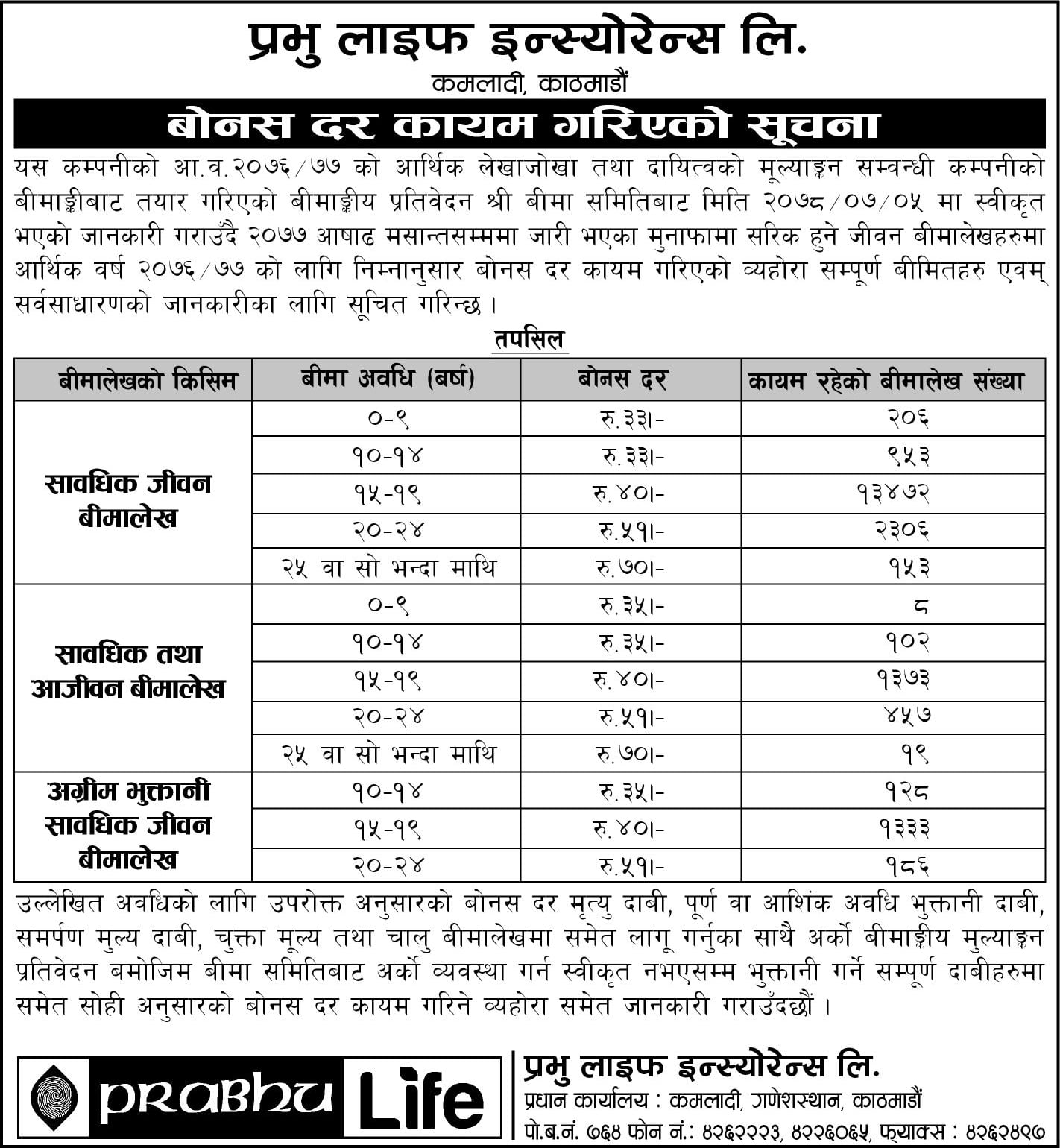 अग्रिम भुक्तानी सावाधिक जीवन बीमालेखमा कम्पनीले १० देखि १४ वर्ष अवधिको लागि ३५ रुपैयाँ , १५ देखि १९ वर्ष अवधिको बीमालेखमा ४० रुपैयाँ, २० देखि २४ वर्ष अवधिको बीमालेखका लागि ५१ रुपैयाँ बोनसदर तोकेको कम्पनीले जनाएको छ ।