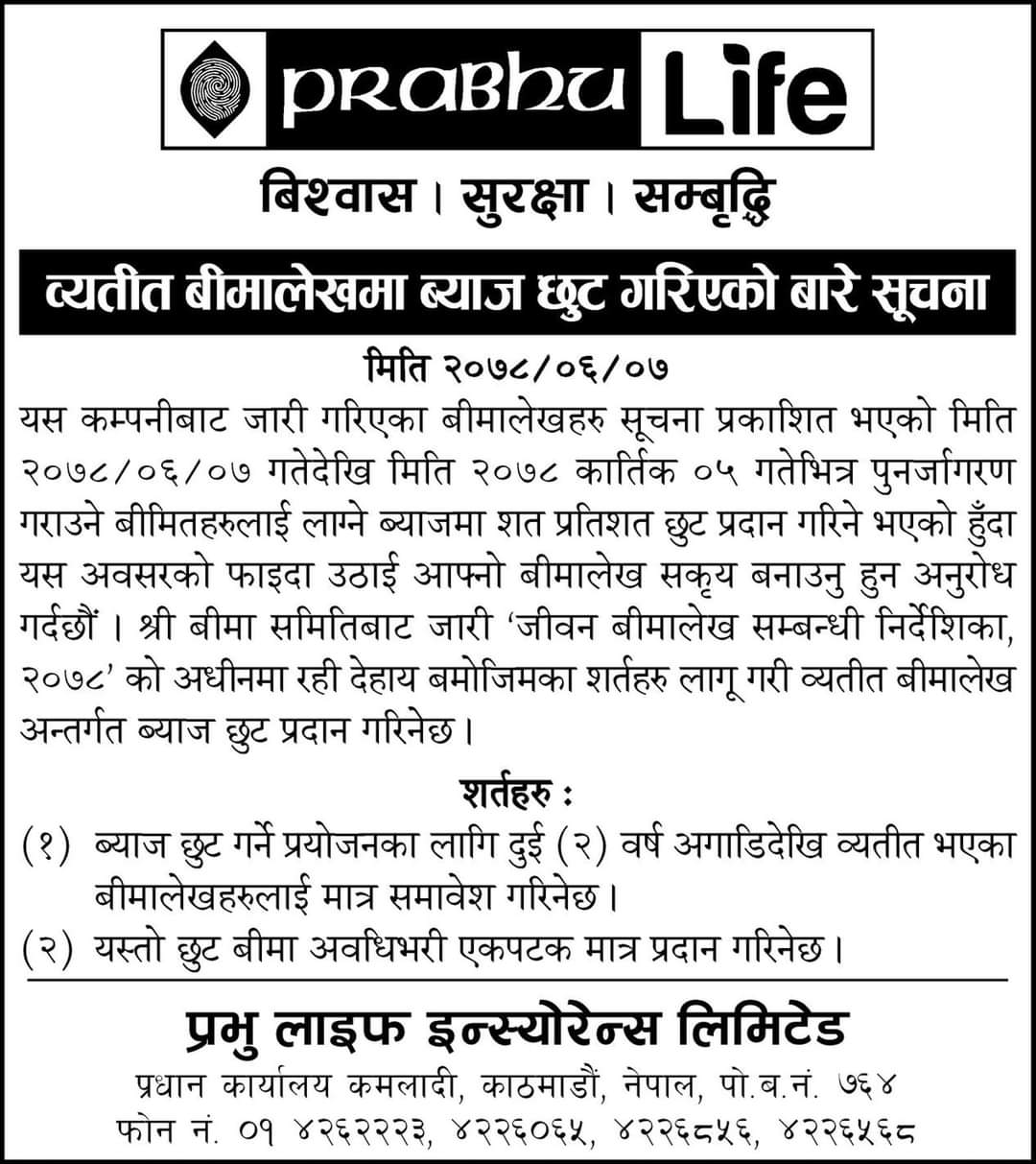 कम्पनीले व्यतित भएका बीमालेखहरु २०७८ असोज ७ गतेदेखि कार्तिक ५ गतेसम्म आवश्यक प्रकृया पूरा गरी पुनर्जागरण गर्दा विलम्ब शुल्क (ब्याज) मा शत प्रतिशत छुट गर्ने जनाएको छ ।