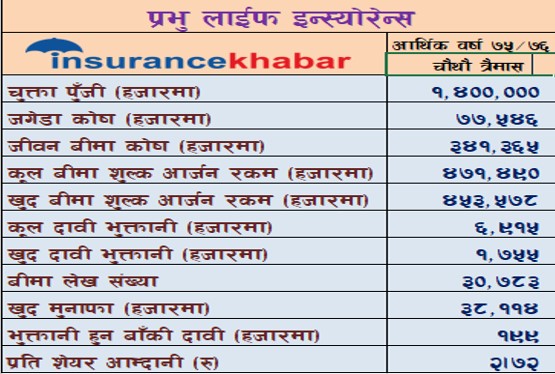 काठमाडौं । प्रभु लाईफ इन्स्योरेन्स कम्पनीले आर्थिक वर्ष २०७५।७६ को चौथोे त्रैमाससम्ममा ४७ करोड १४ लाख रुपैयाँ कुल बीमा शुल्क आर्जन गर्न सफल भएको छ ।