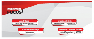 फण्डले नेपाल स्टक एक्सचेन्जमा सूचिकृत भई कारोबारका लागि उपलब्ध कम्पनीहरु मध्येबाट लगानी गर्नुपूर्व आधारभूत तथा प्राविधिक विश्लेषण गरी कम्पनीहरु वर्गीकरण गर्छ र यसरी वर्गीकरण गरेका कम्पनीहरु मध्येमा कम्पनीको व्यवसायिक वृद्धिदर उच्च रहेको, नियमित रुपमा उच्च प्रतिफल प्रदान गर्न सक्ने, वित्तिय अवस्था सवल भएको, संस्थागत सुशासन बलियो भएको तथा निश्चित समयअन्तरालमा बजार सूचक भन्दा उत्कृष्ट प्रदर्शन गर्न सक्ने किसिमका शेयरहरु छनौट गरी त्यसलाई लगानी नीति अन्तरगत रहने ग्रेडिङ्गको पारामिटरमा राखी त्यसबाट पुनः छनौट गरिन्छ । यसरी छनौट गर्दा मुख्यतः भ्यालु र ग्रोथका आधारमा अब्बल देखिने कम्पनीहरु मध्येबाट पनि अधिकतम ३० वटा उत्कृष्ट कम्पनीहरु छनौट गरिनेछ ।
