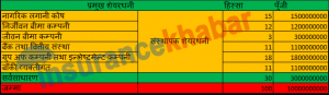 निर्जीवन बीमा कम्पनीको प्रतिवद्धता पछि १२ प्रतिशत छुट्टाइएको छ। जसमा १२ वटा निर्जीवन बीमा कम्पनीको सहभागिता रहेको छ। नेपाल पुनर्बीमा कम्पनीमा लगानी गरेका निर्जीवन बीमा कम्पनी यसमा छैनन्। जीवन बीमा कम्पनीमध्ये तीन वटाले प्रतिवद्धता दिएका थिए। उनिहरुले ३ प्रतिशतको कमिटमेन्ट दिएका छन्।