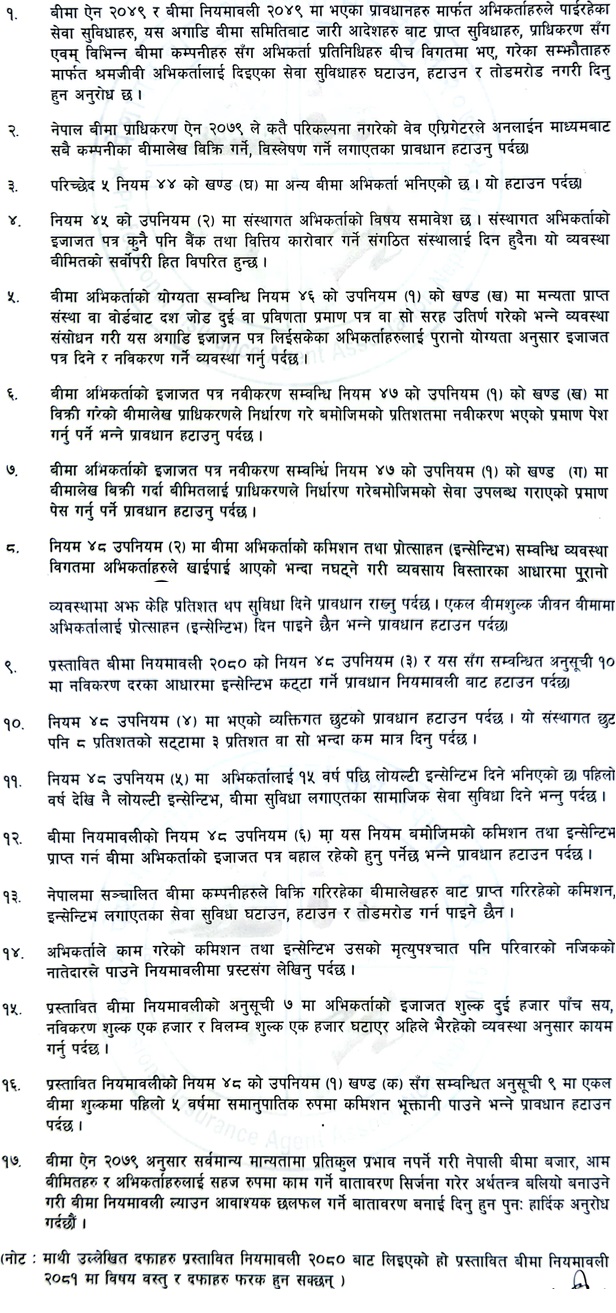 हालको बीमा नियमावली २०८१ मा प्रस्ताव भएका कतिपय विषयहरु जीवन बीमा क्षेत्रलाई बदनाम गर्ने मनसाय राखेको संघले ठहर छ। ‘प्रस्तावित नियमावलीबाट पर्न जाने भयावह असरको जिम्मा नेपाल सरकार, अर्थ मन्त्रालय र स्वयं बीमा प्राधिकरणले लिनुपर्छ’, संघले भनेको छ, ‘यसर्थ प्रस्तावित बीमा नियमावलीको अन्तिम मस्यौदा मन्त्रिपरिषदमा पेस हुनुअघि पेसागत बीमा अभिकर्ता संघ नेपालसँग आवश्यक छलफल गरी ल्याउने वातावरण बनाउनुपर्छ।’